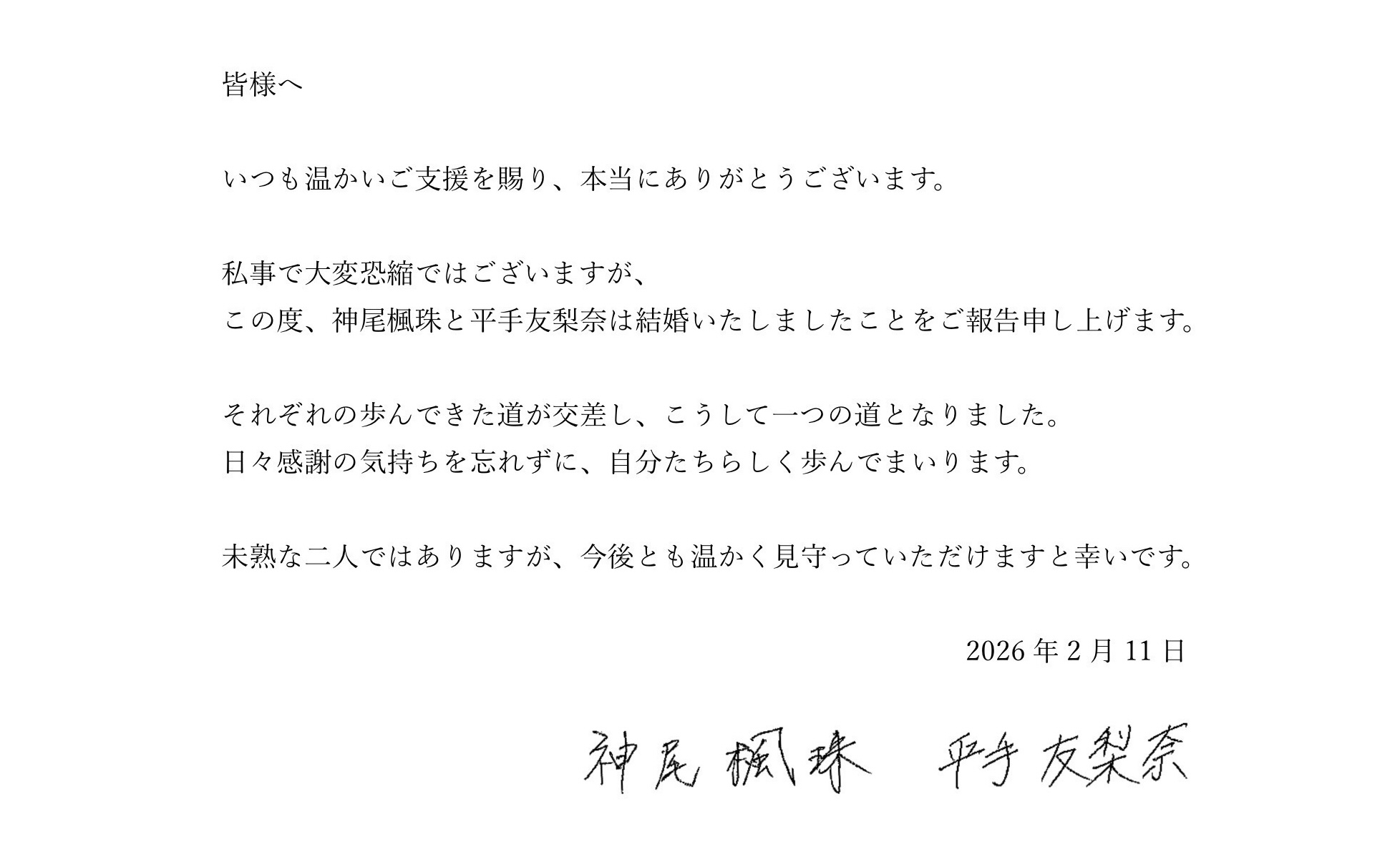 この度、神尾楓珠が結婚したことをご報告させていただきます。